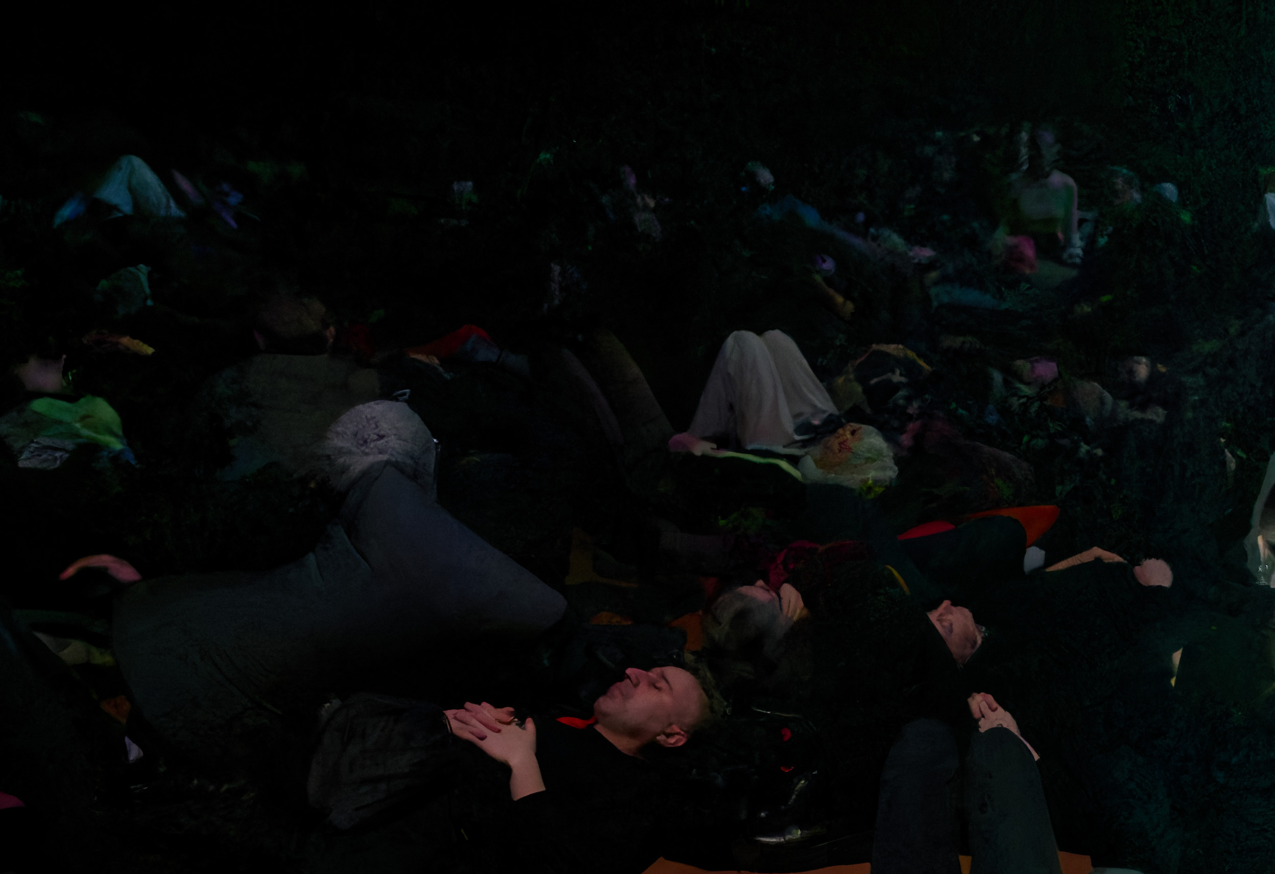 Embora a experiência seja voltada para dentro, ela acontece em um campo compartilhado, um tecido social sutil formado pelo som em movimento. Os corpos se co-regulam por meio da pressão sonora, da respiração e da presença, gerando uma coerência energética coletiva que vai além da percepção individual.